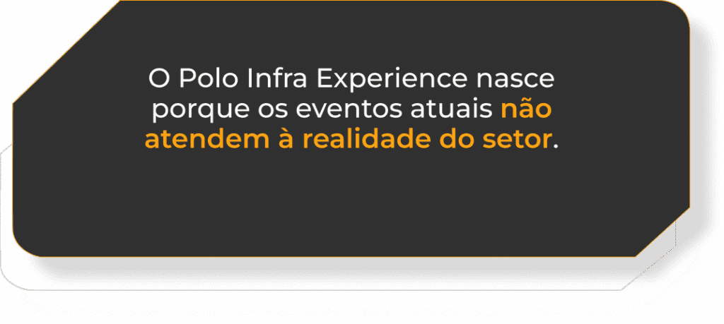 O Polo Infra Experience é um evento presencial dedicado à realidade da infraestrutura. Um encontro que conecta profissionais, empresas e especialistas em um ambiente onde o conteúdo técnico é aplicável, a troca é genuína e as conexões acontecem de forma natural e humanizada.